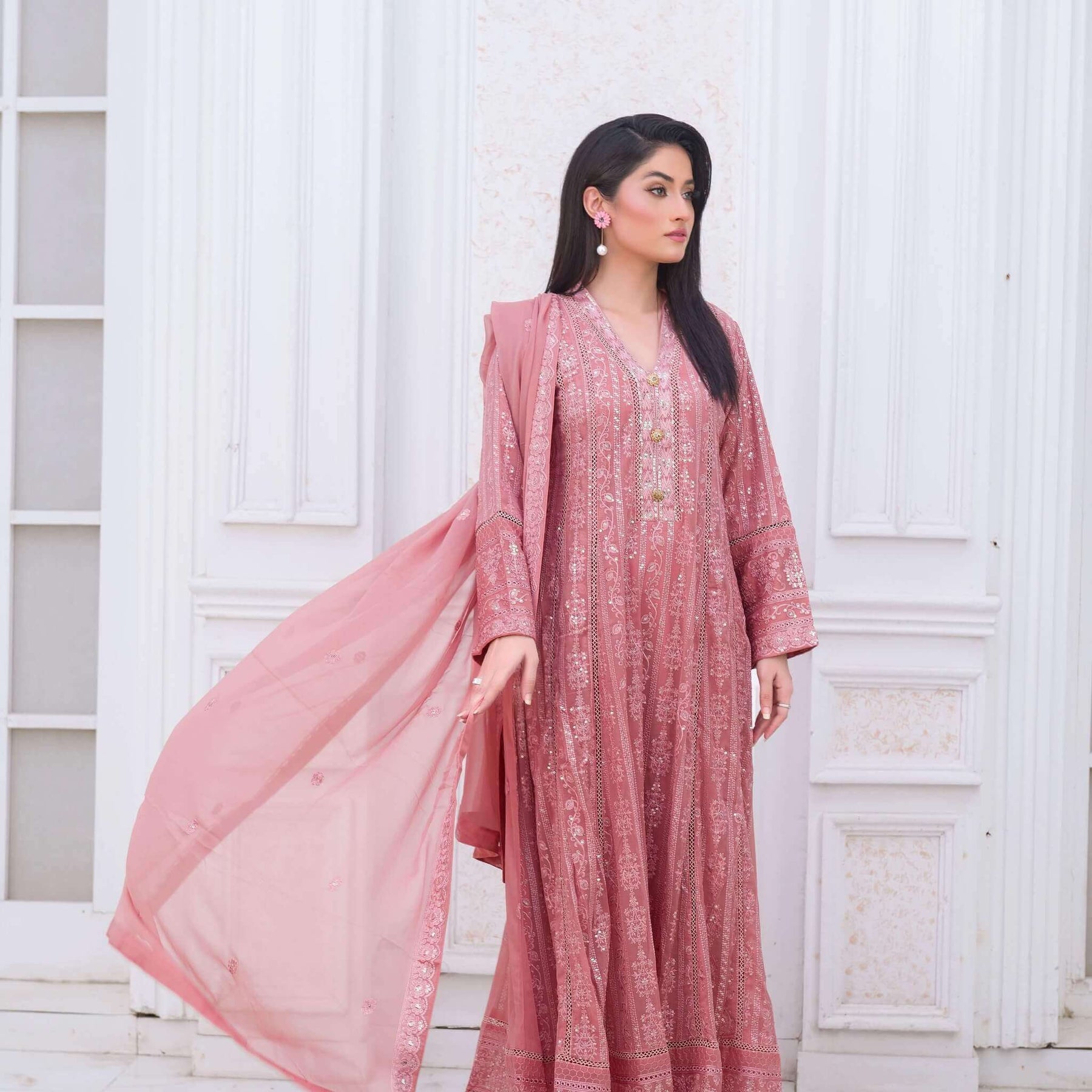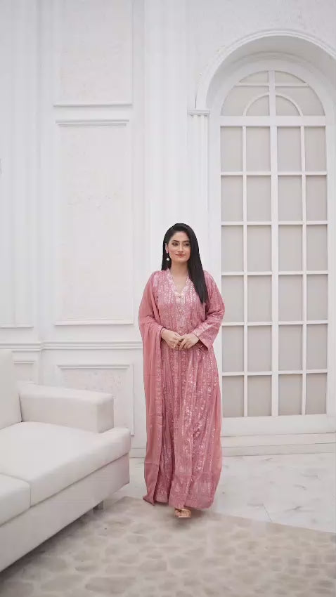 Elegant pink chiffon anarkali maxi dress with long sleeves and a flowy silhouette, perfect for weddings, parties, and evening wear. Crafted from lightweight chiffon for comfort and style, this long chiffon dress features a modest neckline, full sleeves, and flattering fit. Ideal as a bridesmaid outfit, reception dress, or formal wear. Includes matching dupatta. Available in multiple sizes with fast USA shipping.