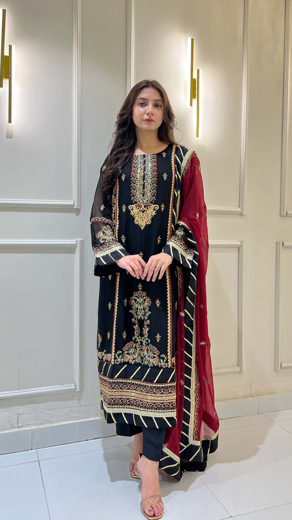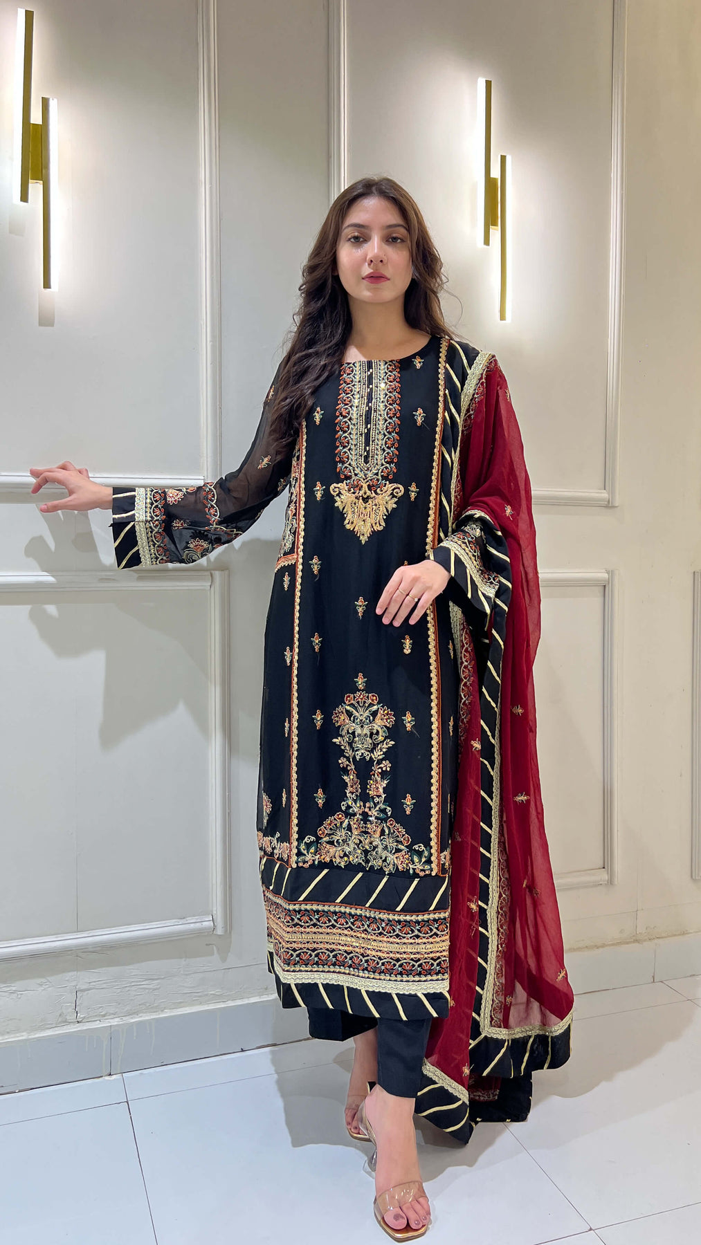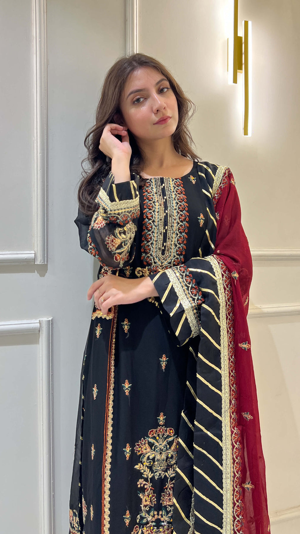 Elegant black chiffon 3-piece shalwar kameez with intricate hand embroidery. Features a vibrant maroon dupatta. Perfect for weddings, parties, and cultural events. Crafted for festive occasions, this suit offers timeless style and comfort. Ideal for women seeking traditional Pakistani and Indian attire.