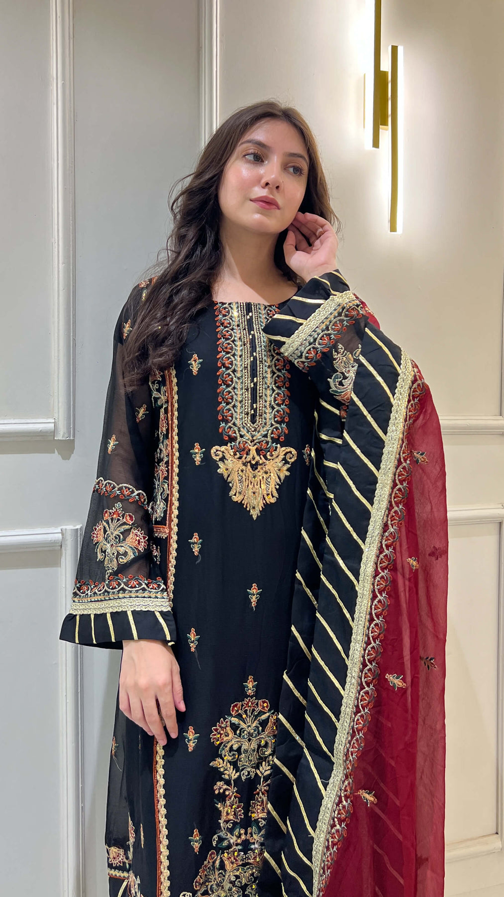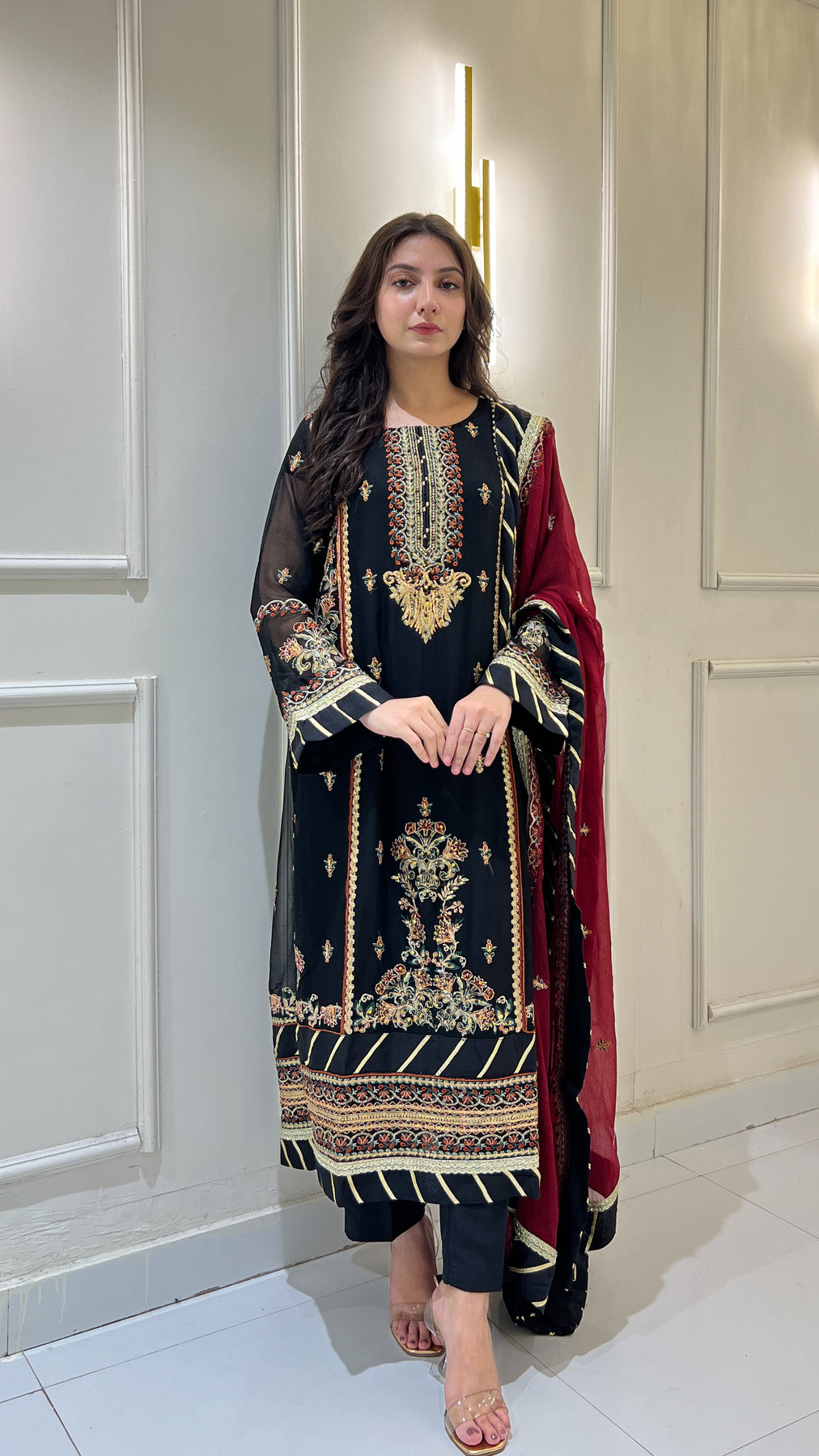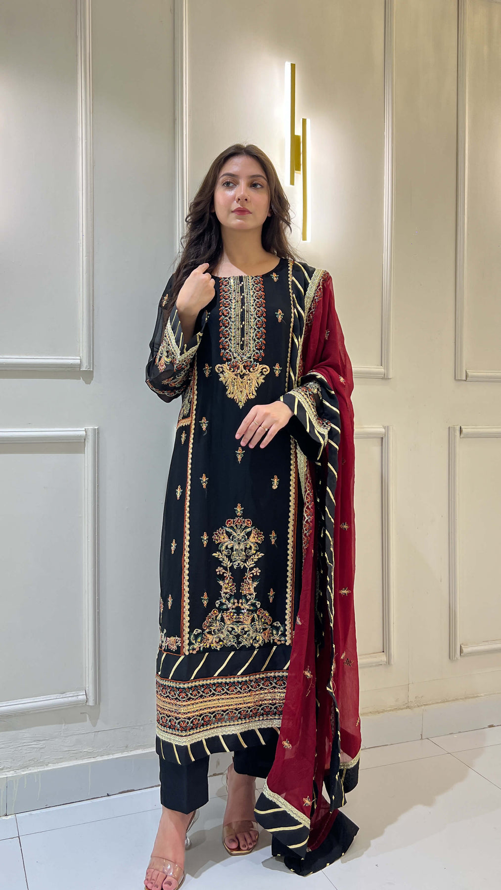 Elegant black chiffon 3-piece shalwar kameez with intricate hand embroidery. Features a vibrant maroon dupatta. Perfect for weddings, parties, and cultural events. Crafted for festive occasions, this suit offers timeless style and comfort. Ideal for women seeking traditional Pakistani and Indian attire.