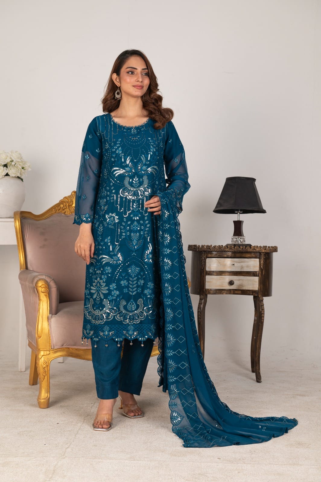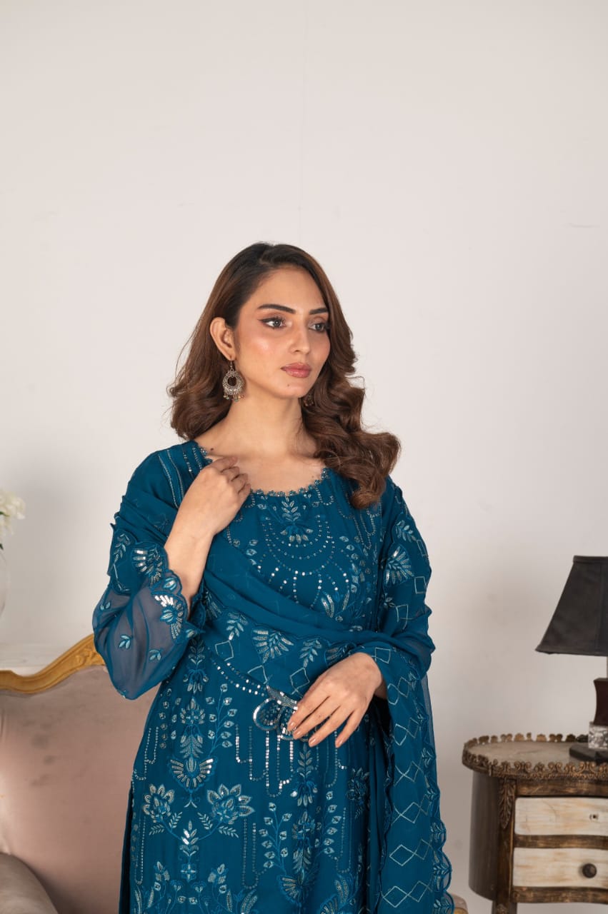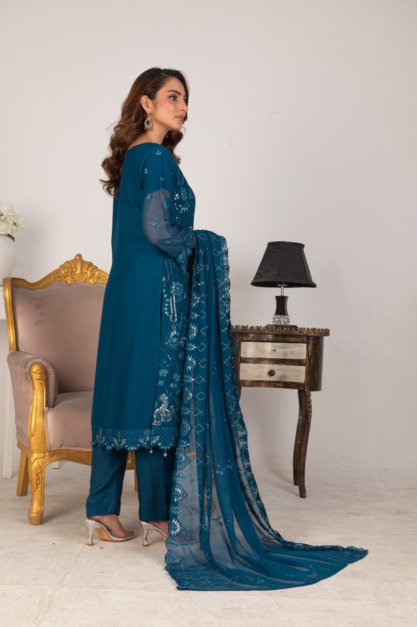 Peacock Blue chiffon shalwar kameez suit with elegant embroidery. Lightweight, flowy, and perfect for Eid, weddings, and semi-formal occasions.