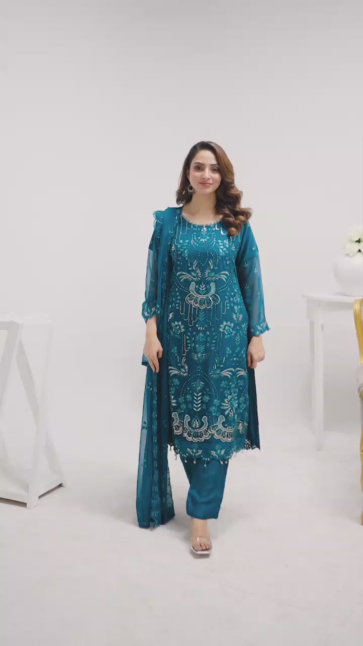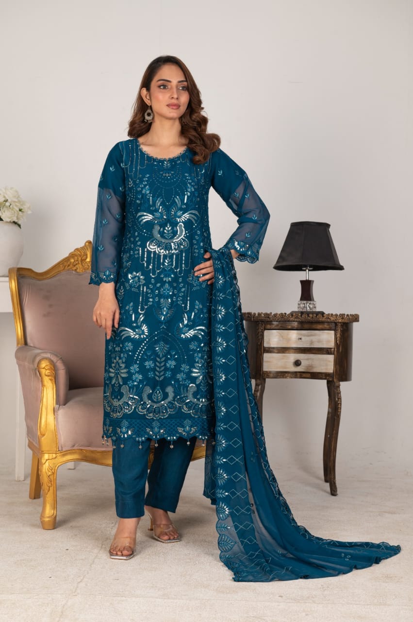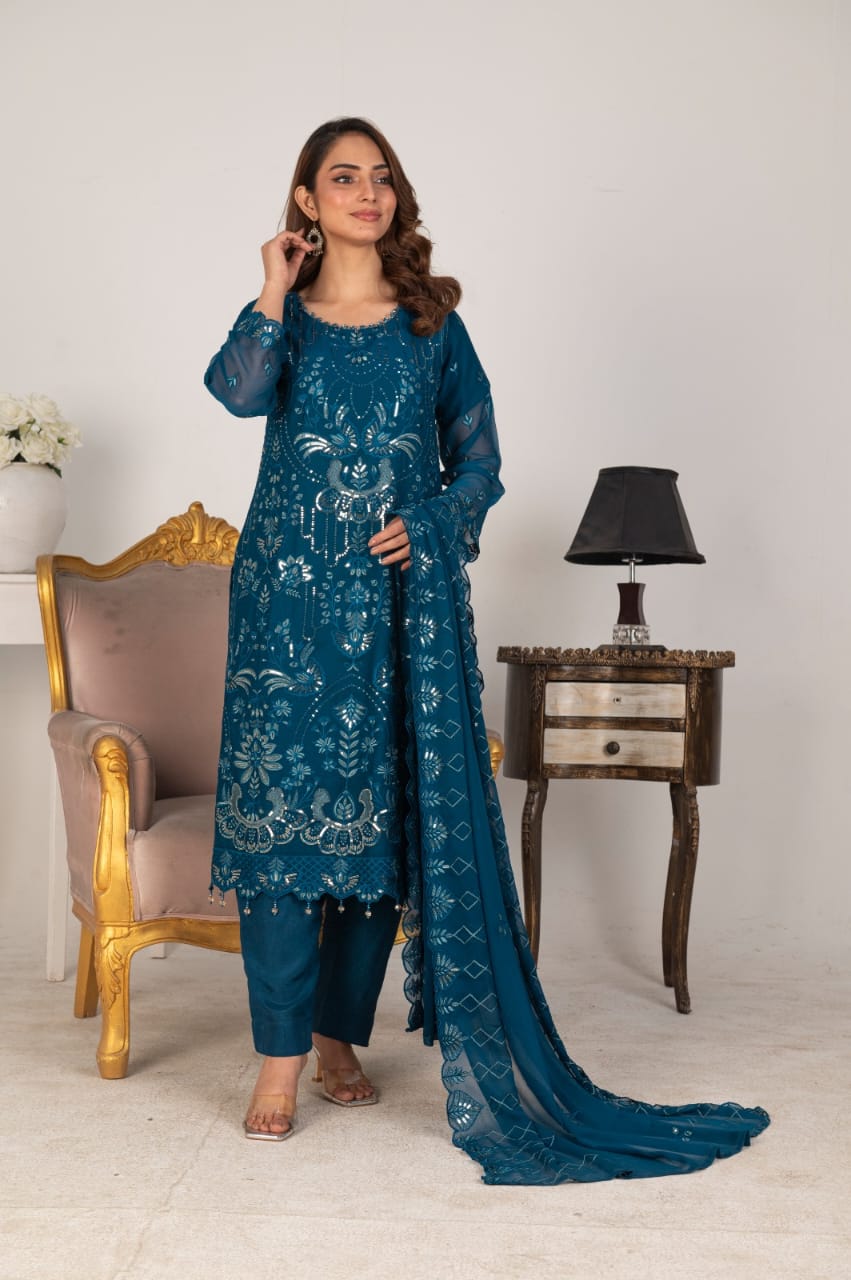 Peacock Blue chiffon shalwar kameez suit with elegant embroidery. Lightweight, flowy, and perfect for Eid, weddings, and semi-formal occasions.