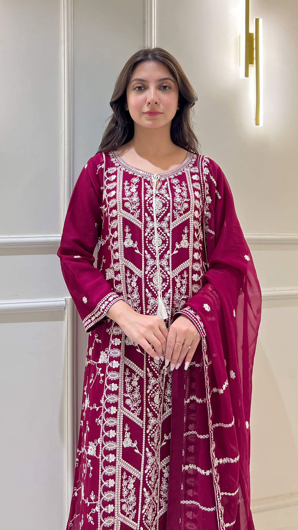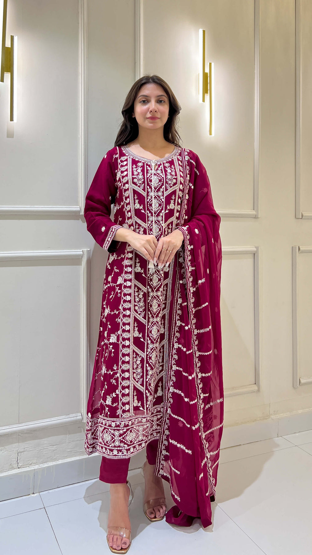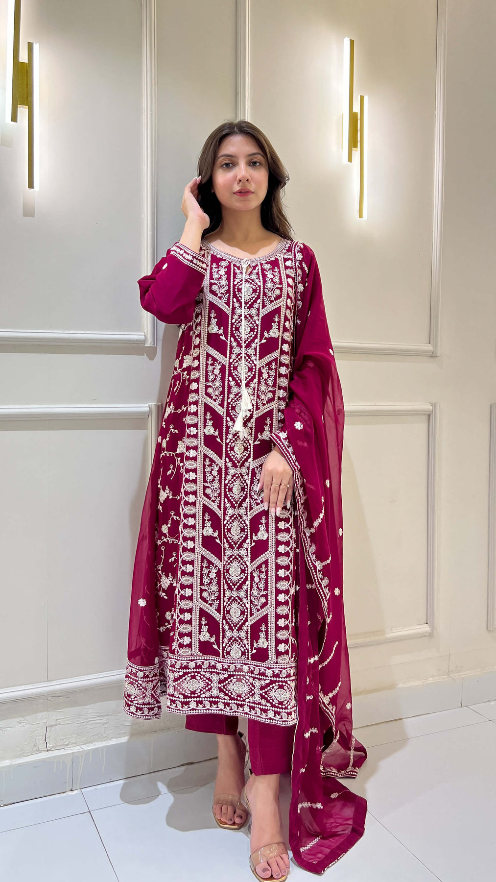 Magenta Chiffon White Embroidered Shalwar Kameez 3-Piece Suit