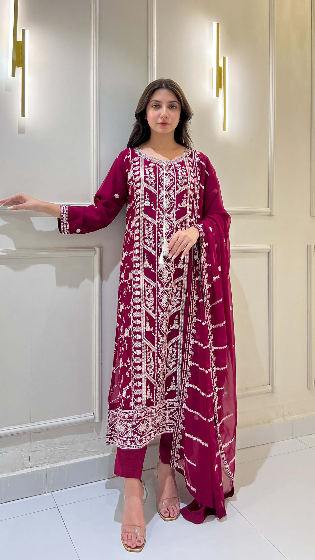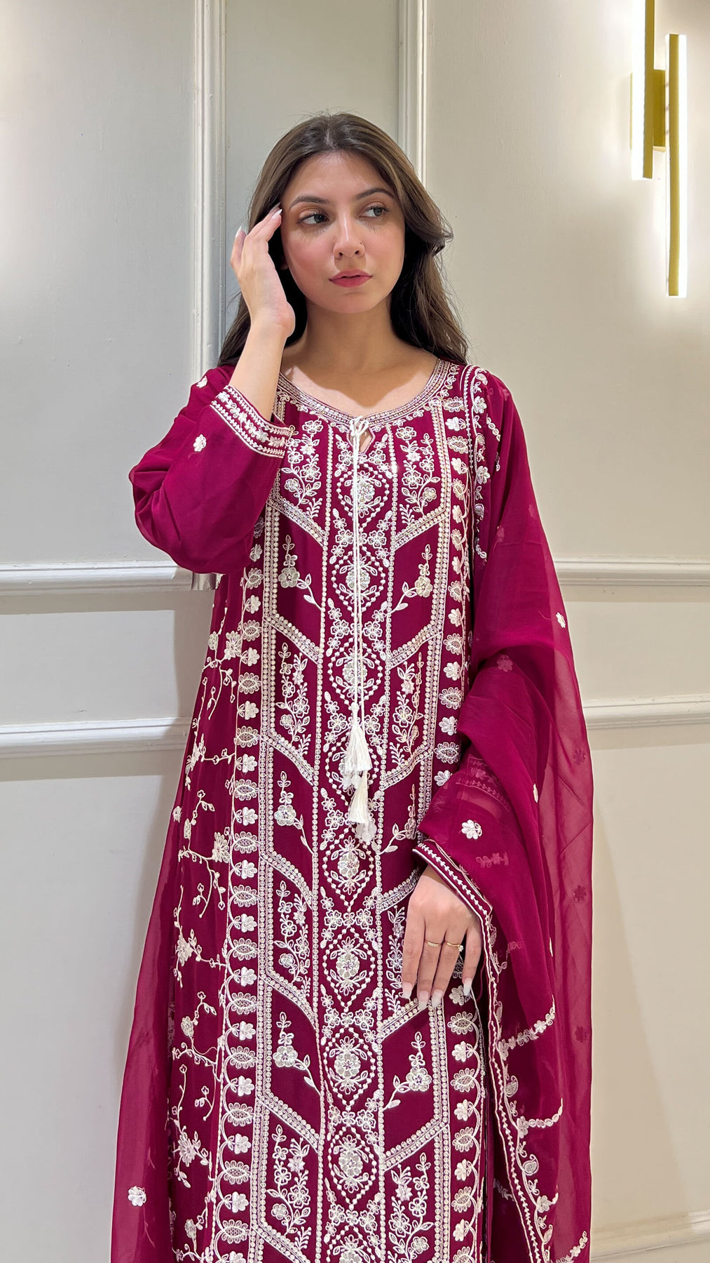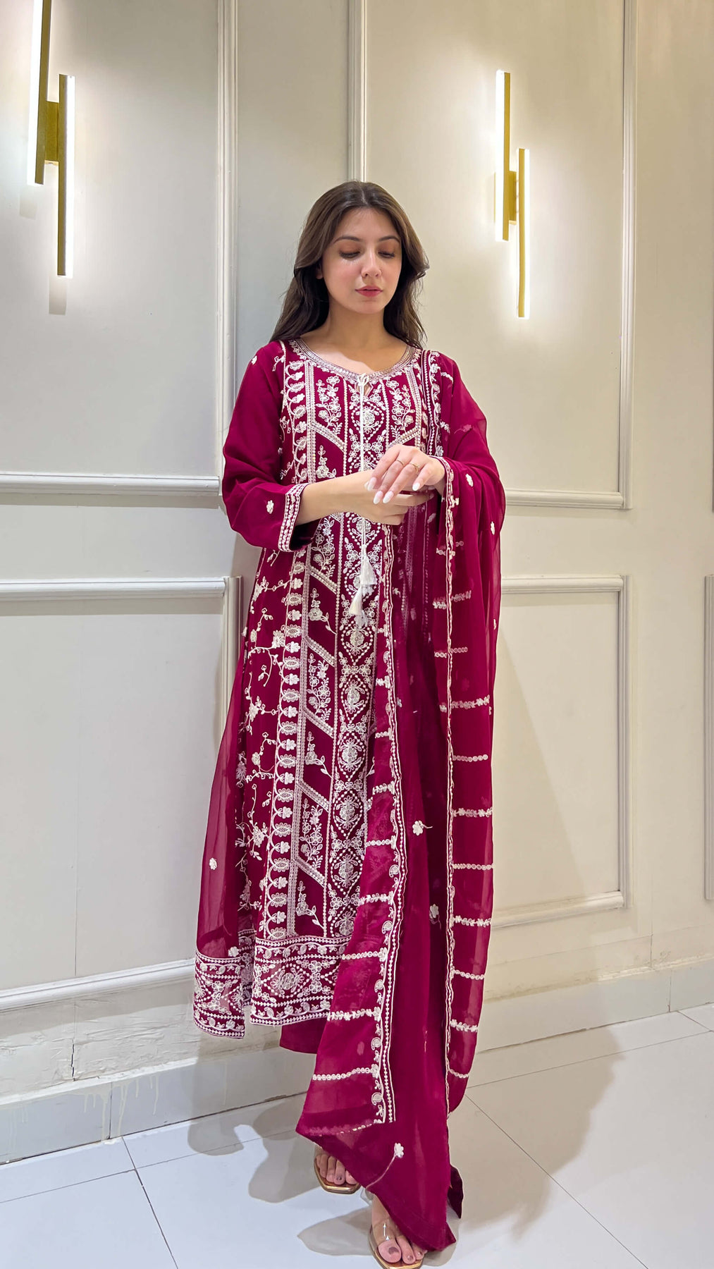 Magenta chiffon 3-piece shalwar kameez with white embroidery, including shirt, trouser, and dupatta. Light and flowy, ideal for weddings, parties, and cultural events. Perfect for women seeking elegant Pakistani and Indian attire.