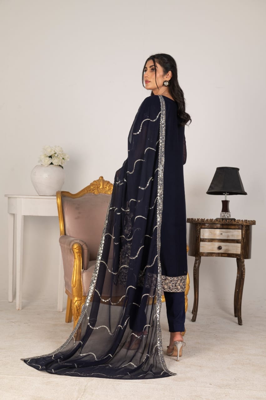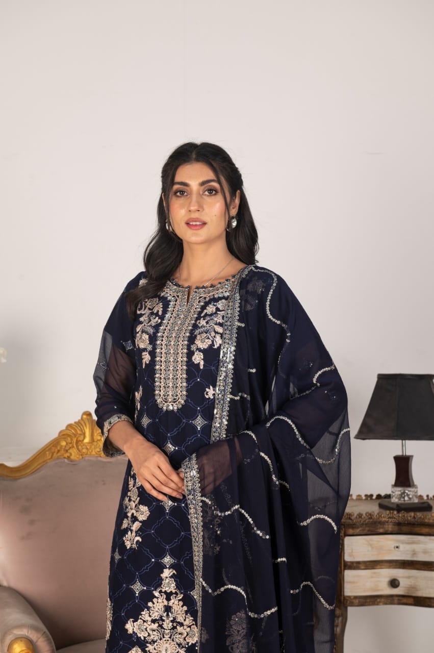 Navy Blue Chiffon with White Embroidery – 3-Piece Suit