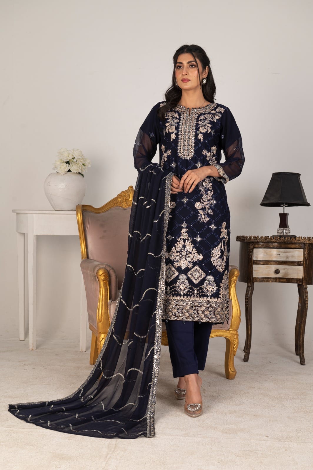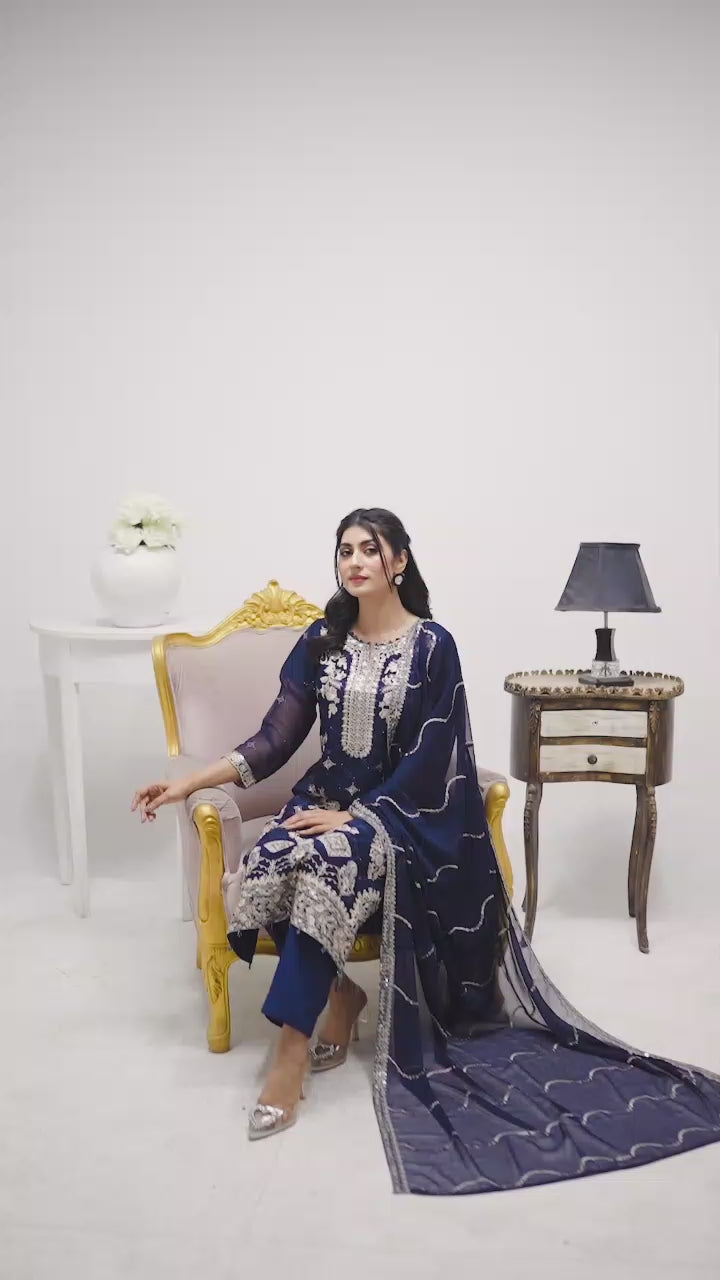 Navy blue chiffon 3-piece suit with elegant white embroidery. Flowy, modest, and perfect for weddings, Eid, and formal South Asian events.