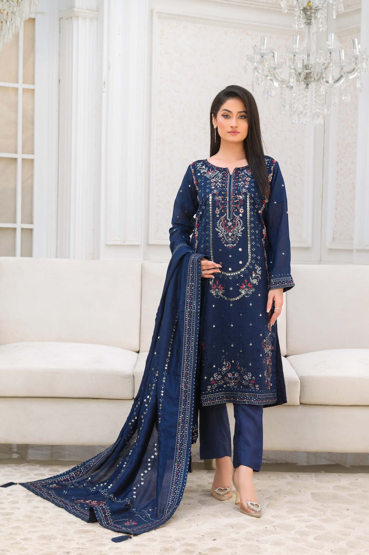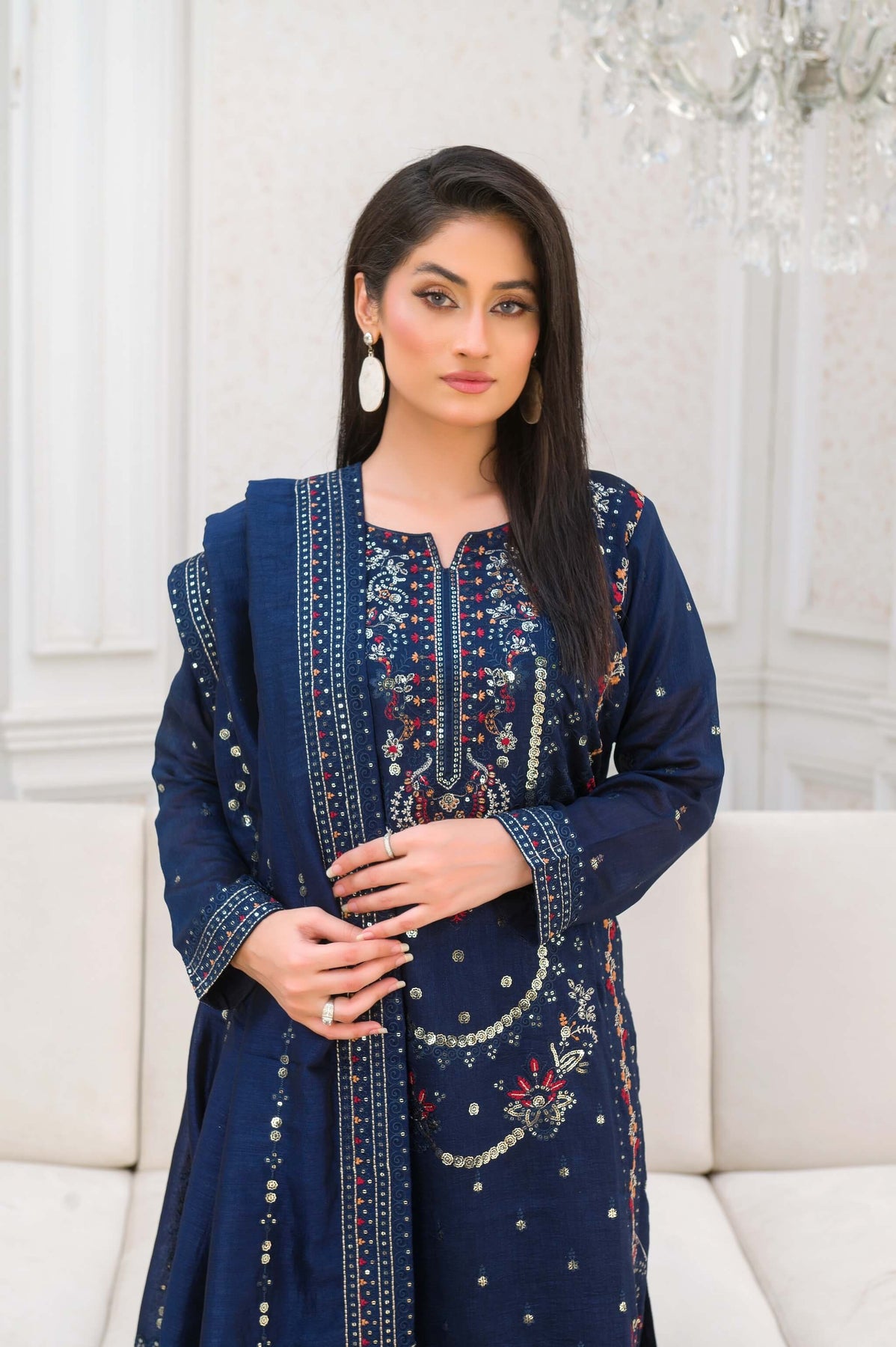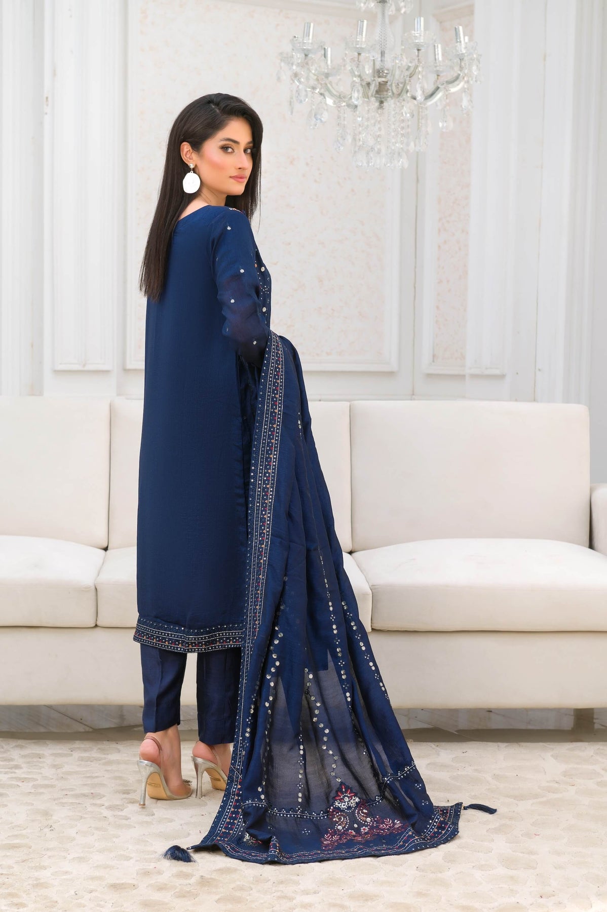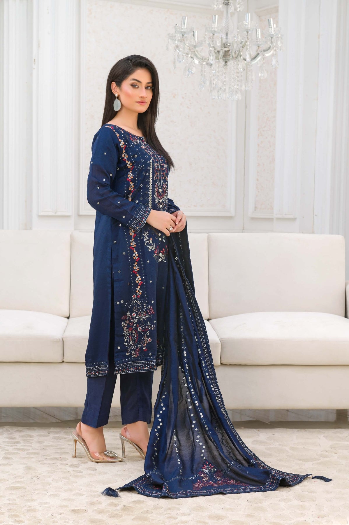 Navy Blue Raw Silk Shalwar Kameez with Multicolor Embroidery – Formal Salwar Suit for Women