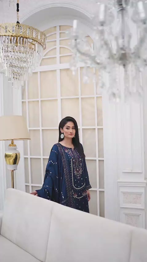 Elevate your style with this Navy Blue Raw Silk Shalwar Kameez, beautifully designed with multicolor embroidery for a rich, festive look. Crafted from premium raw silk fabric, this outfit blends traditional elegance with modern design, making it perfect for weddings, formal gatherings, and festive occasions. The set includes a finely tailored kameez, salwar, and matching dupatta. A timeless raw silk salwar suit that adds luxury and sophistication to your wardrobe.