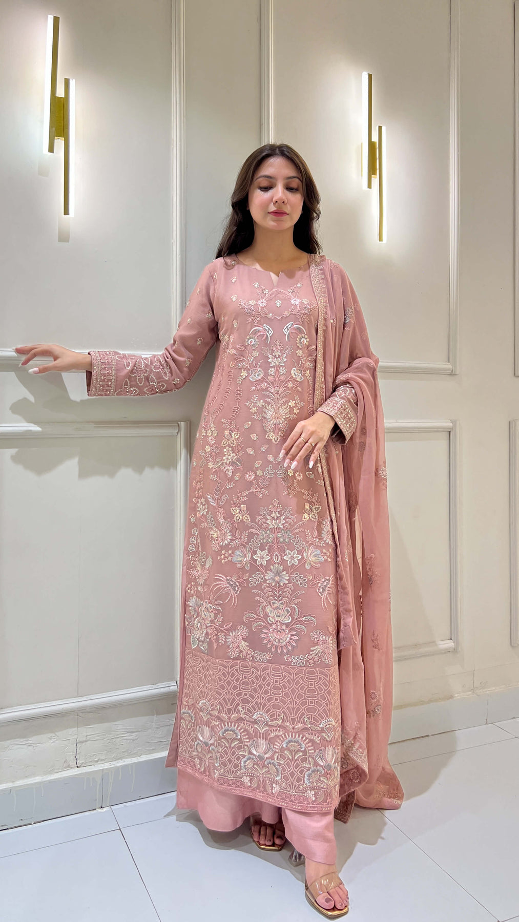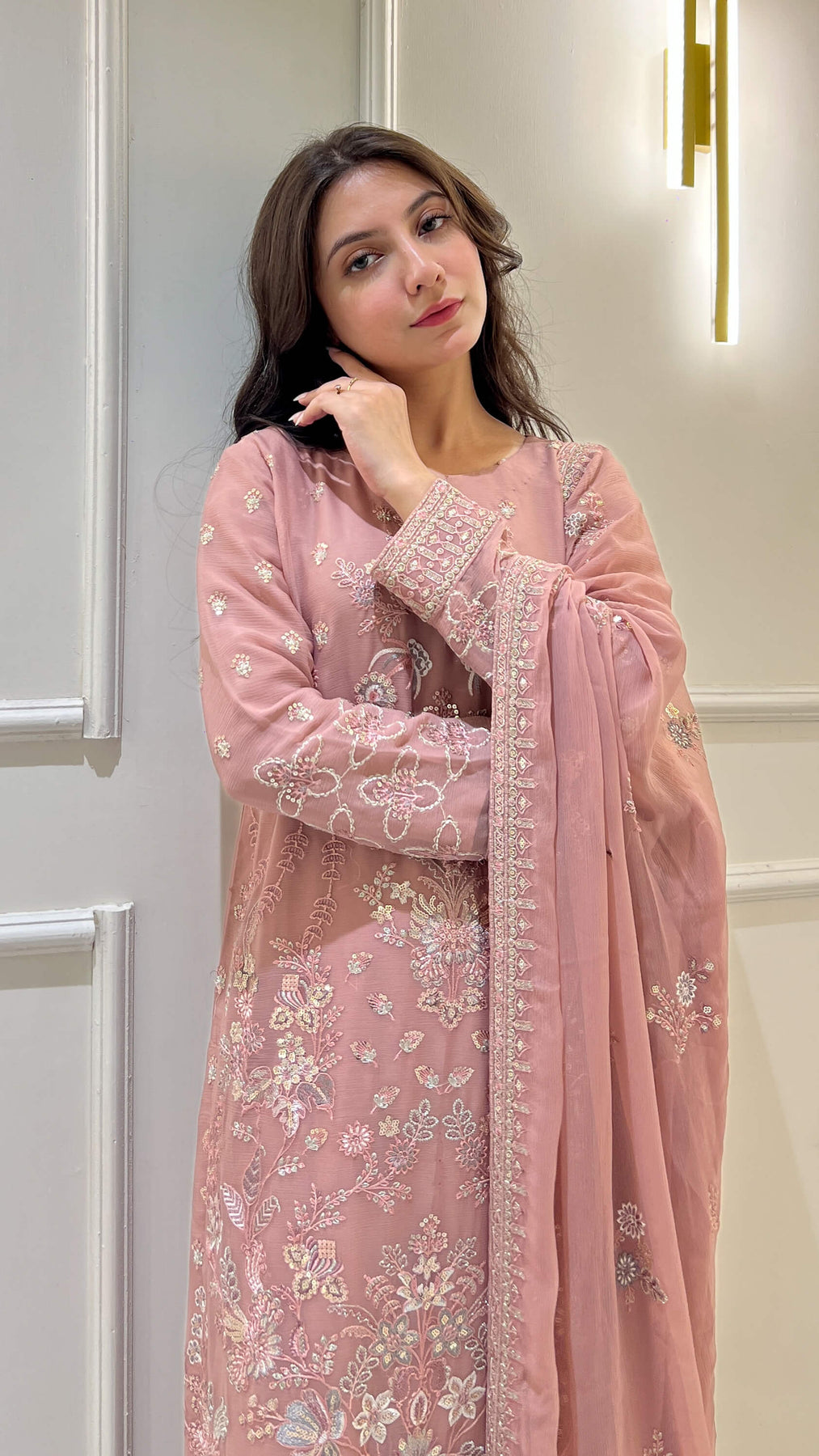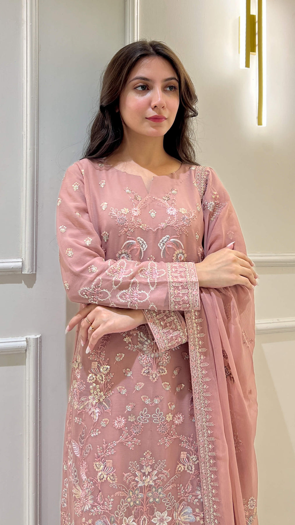 Tea pink chiffon 3-piece shalwar kameez with embroidered dupatta. Lightweight and flowy, ideal for weddings, parties, and festive gatherings. Perfect for women seeking chic Pakistani and Indian attire with elegant comfort.