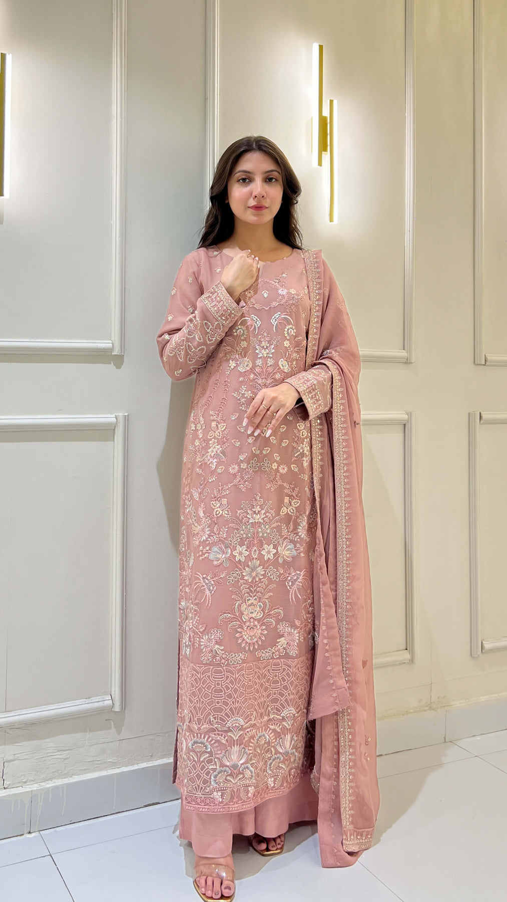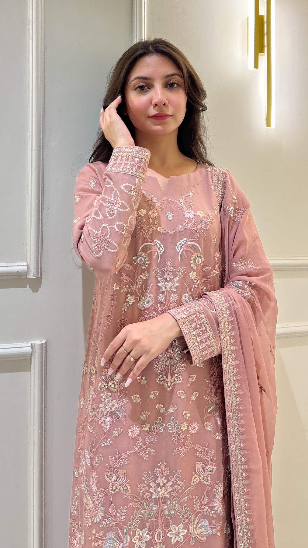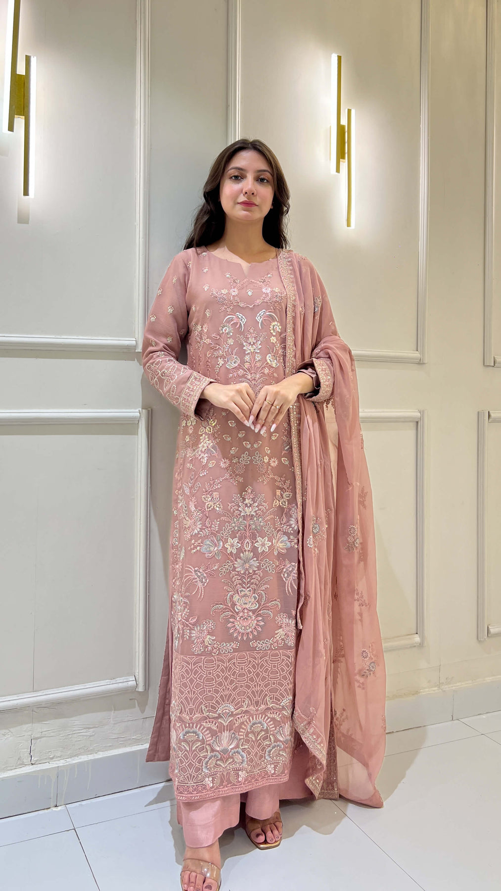 Tea pink chiffon 3-piece shalwar kameez with embroidered dupatta. Lightweight and flowy, ideal for weddings, parties, and festive gatherings. Perfect for women seeking chic Pakistani and Indian attire with elegant comfort.