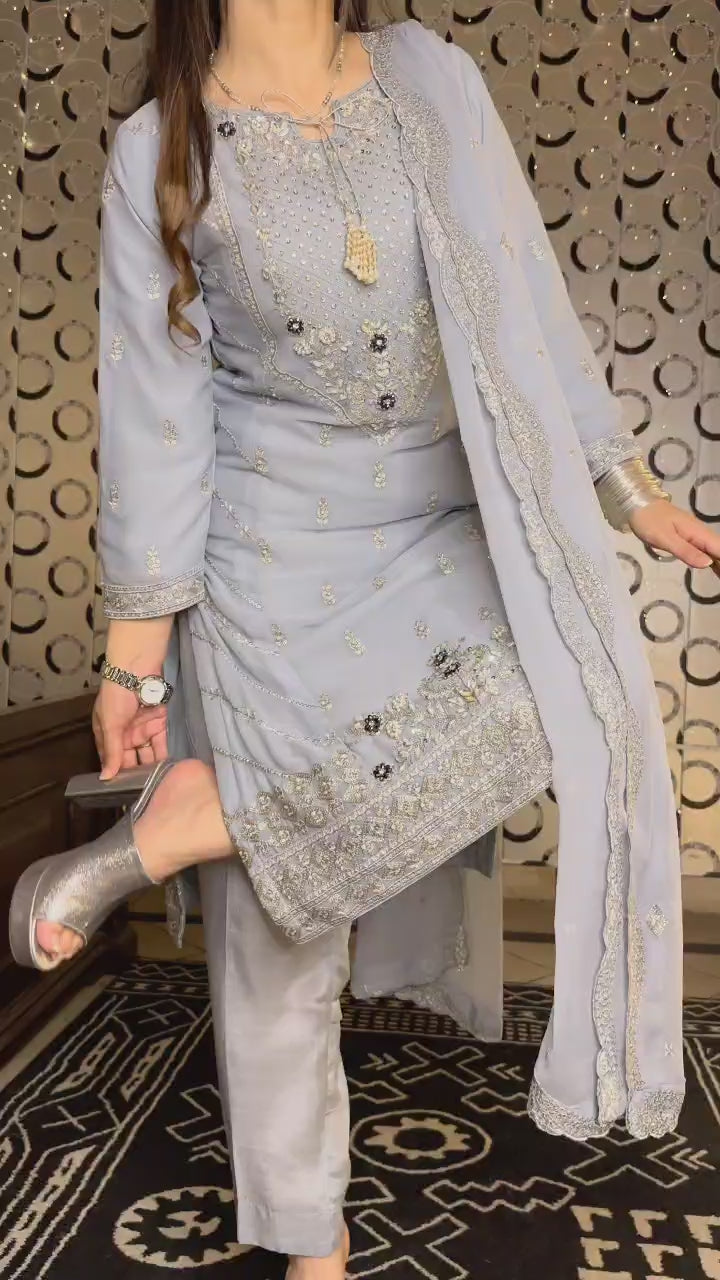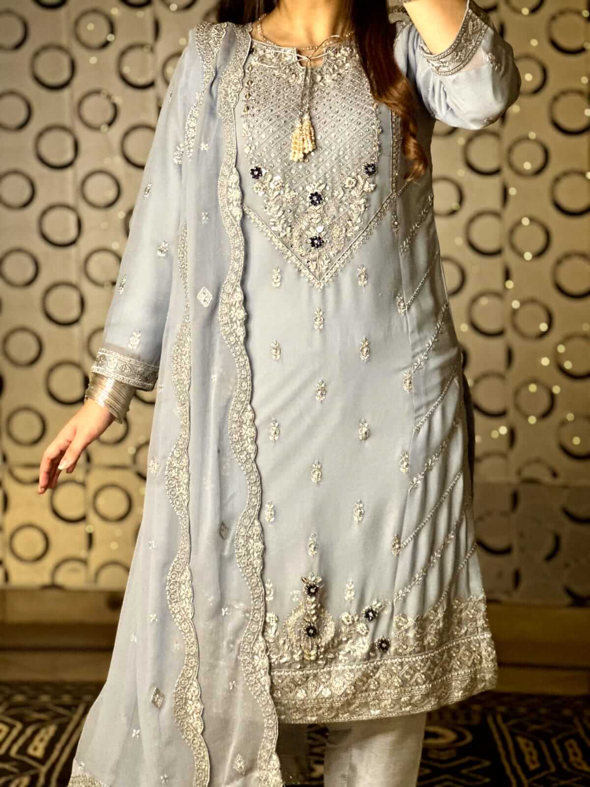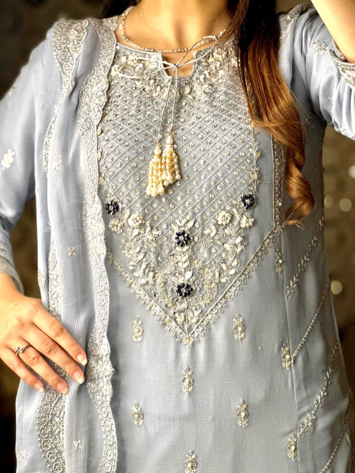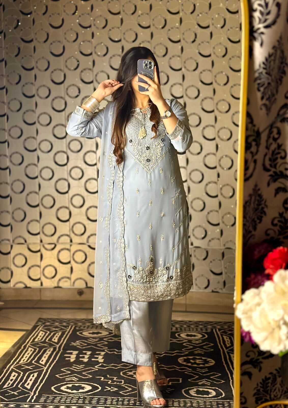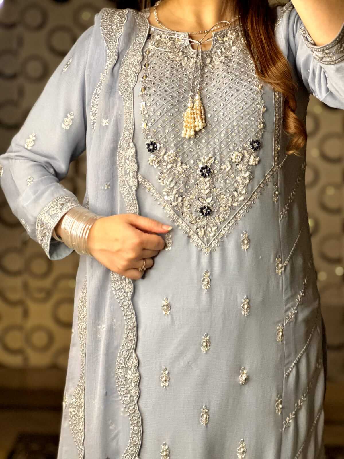 Women's Light Gray Chiffon Shalwar Kameez with Handwork