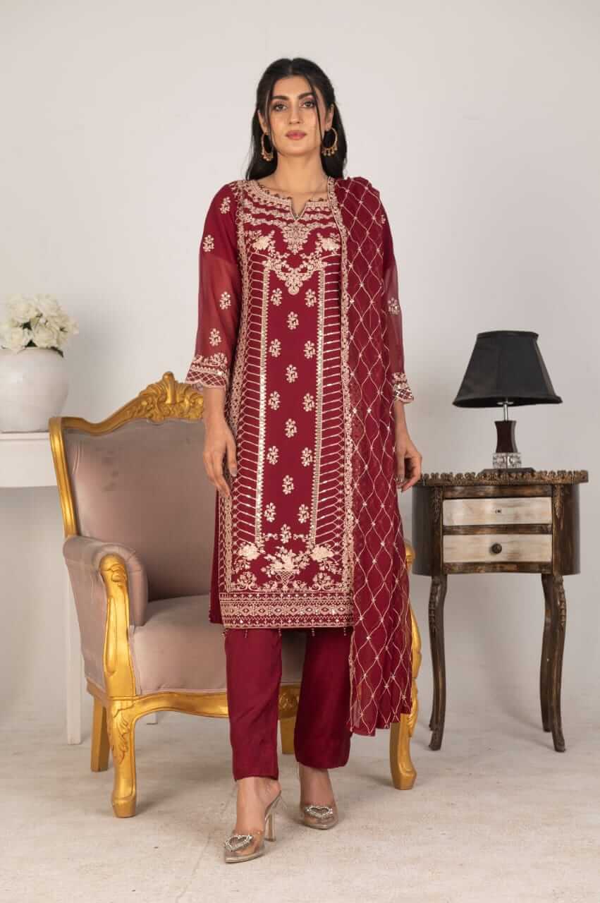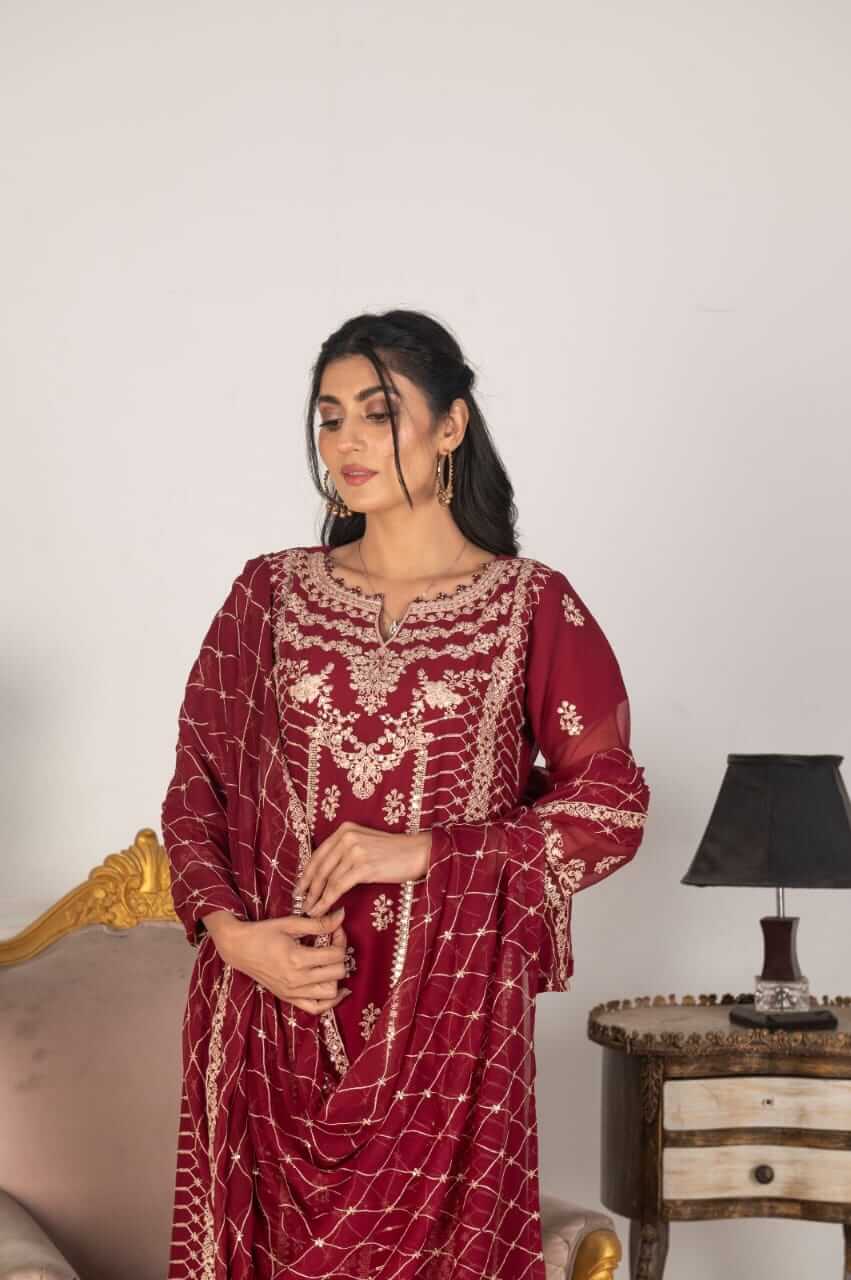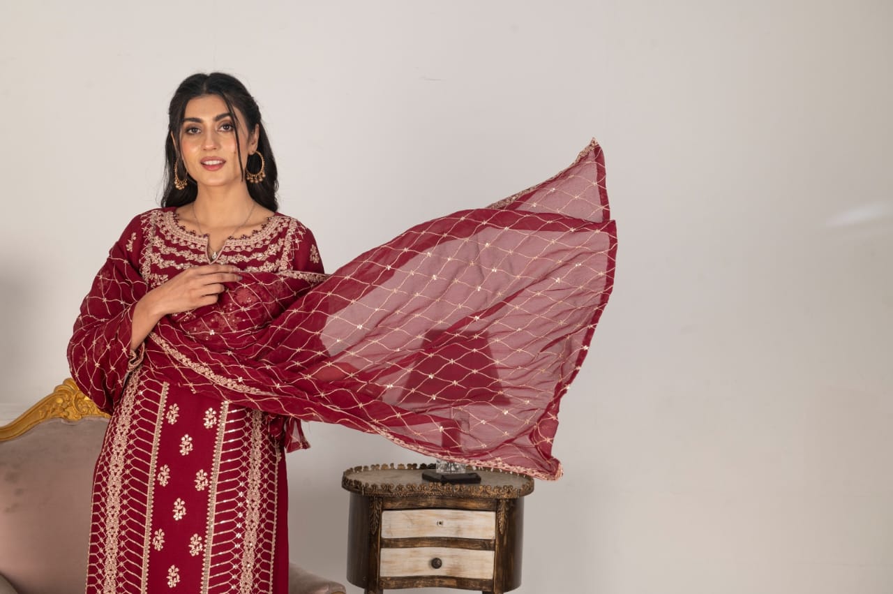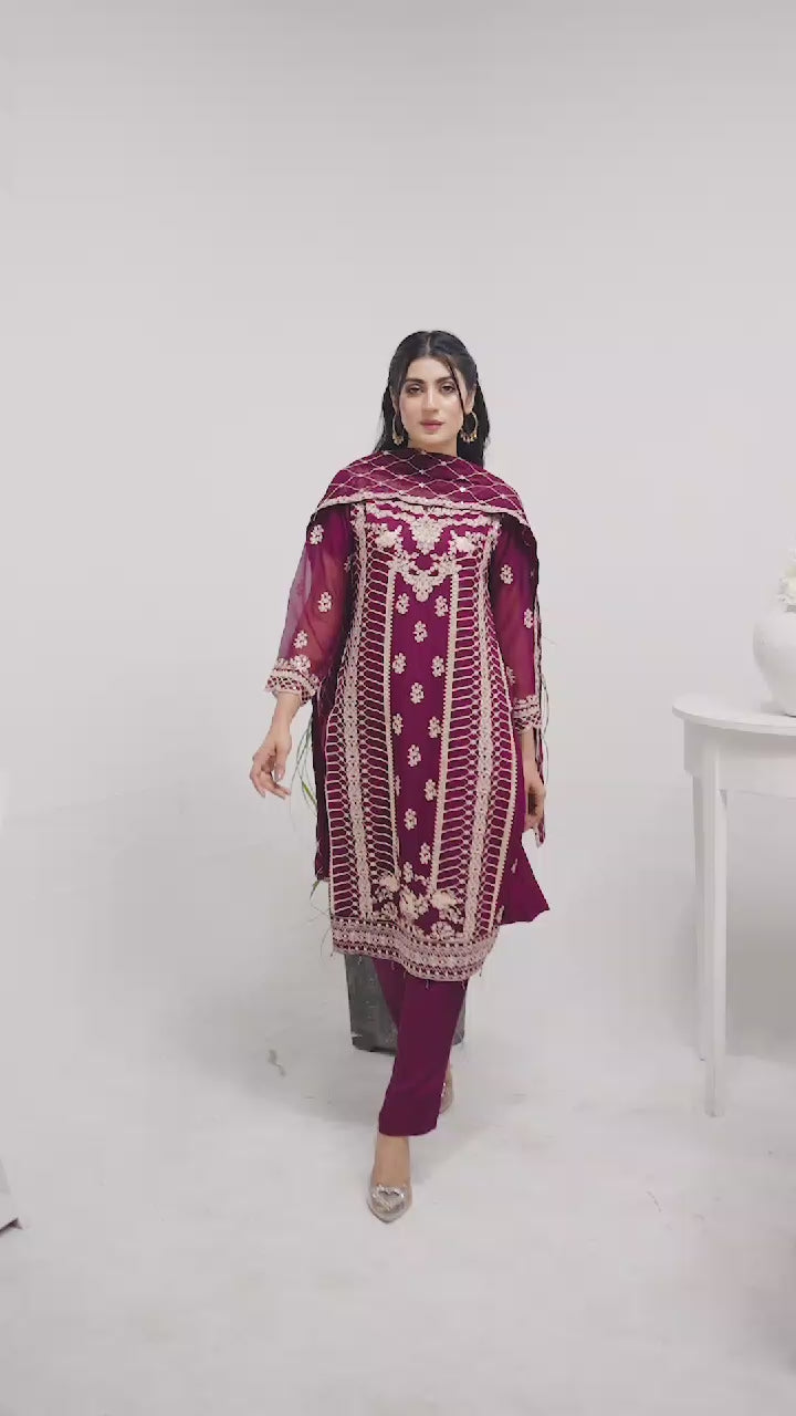 Elevate your style with our Women’s Magenta Chiffon Shalwar Kameez, featuring a stunning heavy dupatta with intricate embroidery. This three-piece set is perfect for weddings, Eid, or festive events. Crafted for elegance, it’s available in S-XL. Enjoy free shipping!