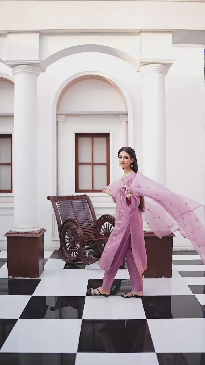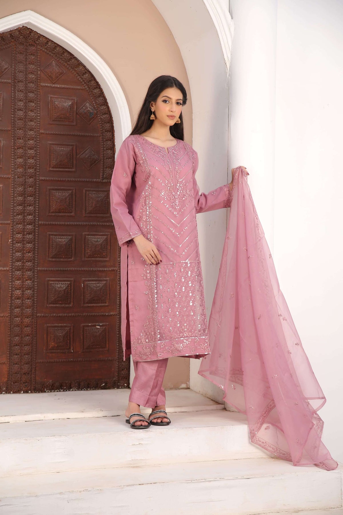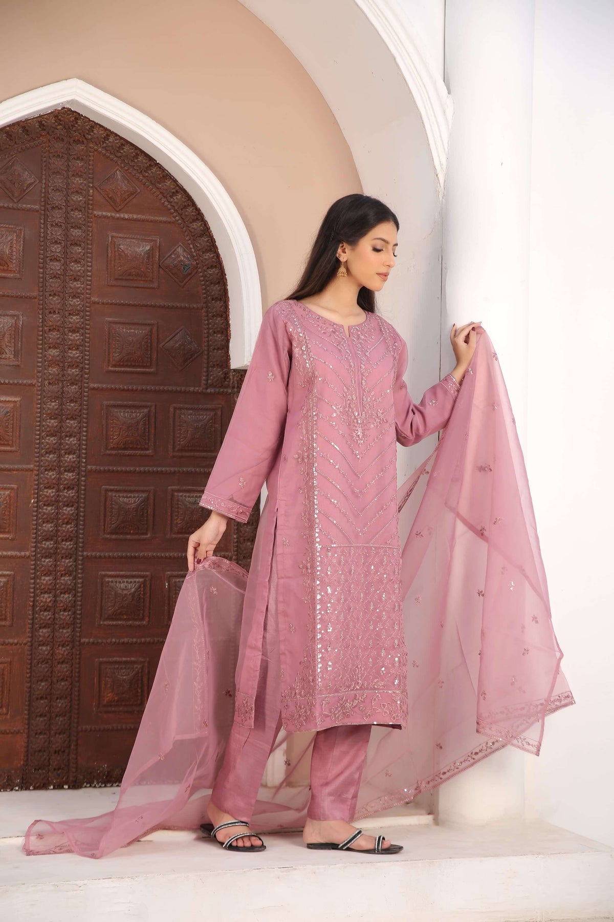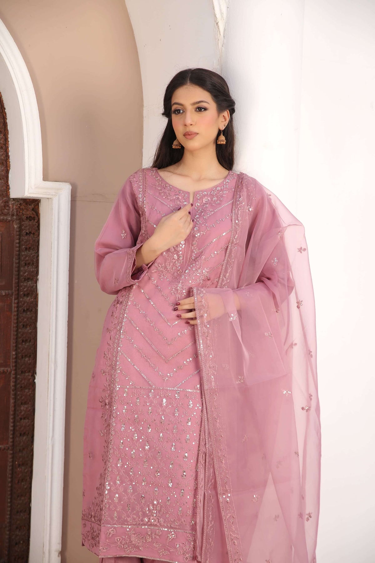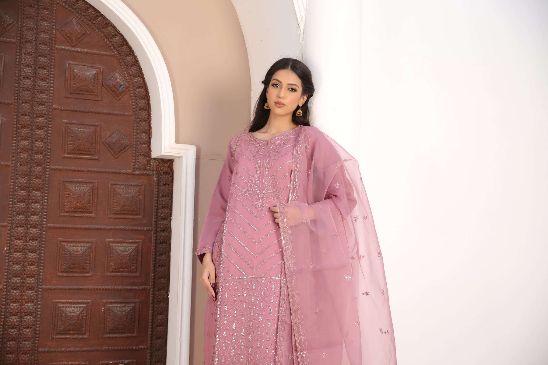 Woman in a pink traditional organza fabric shalwar kameez outfit standing 3 pc complete