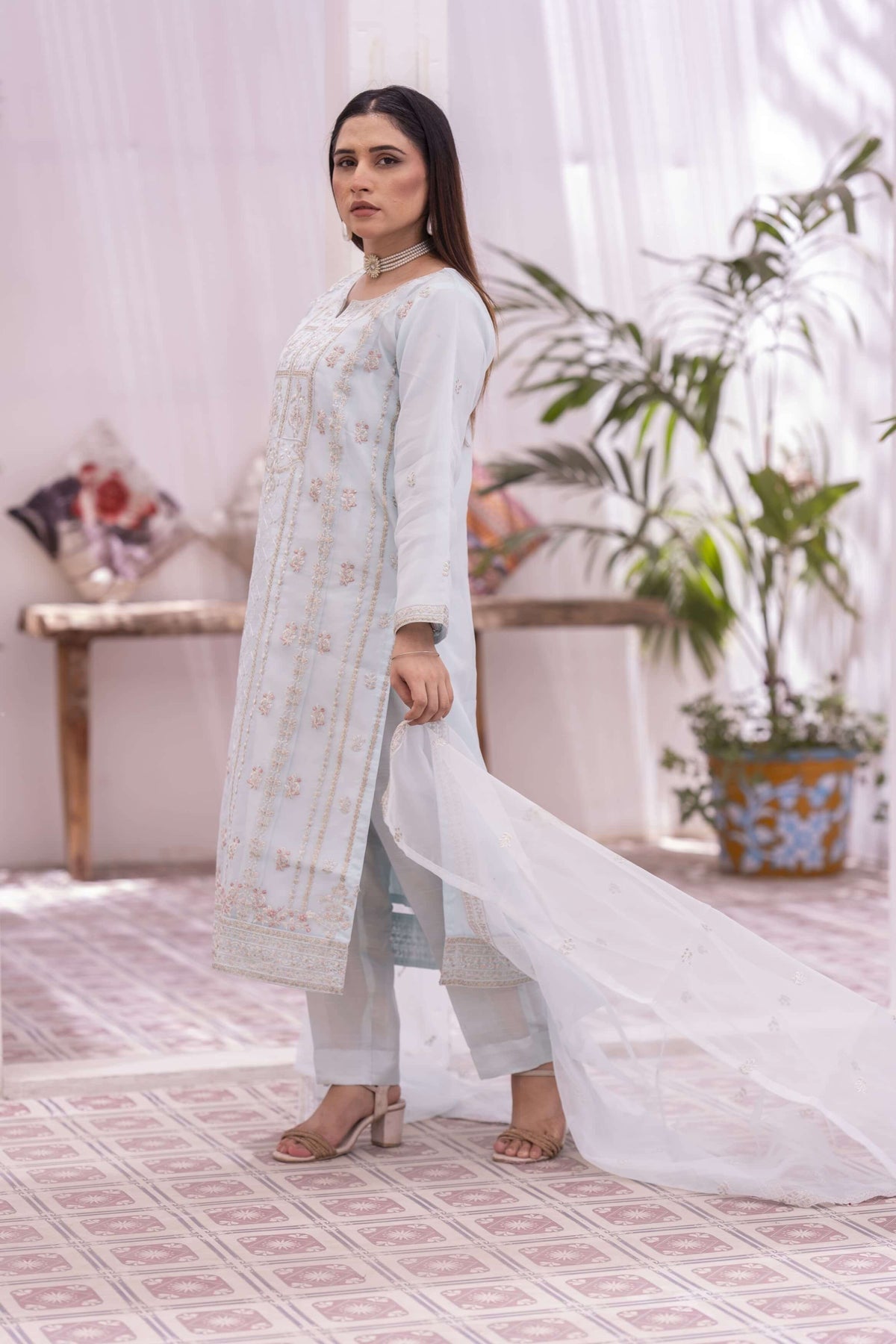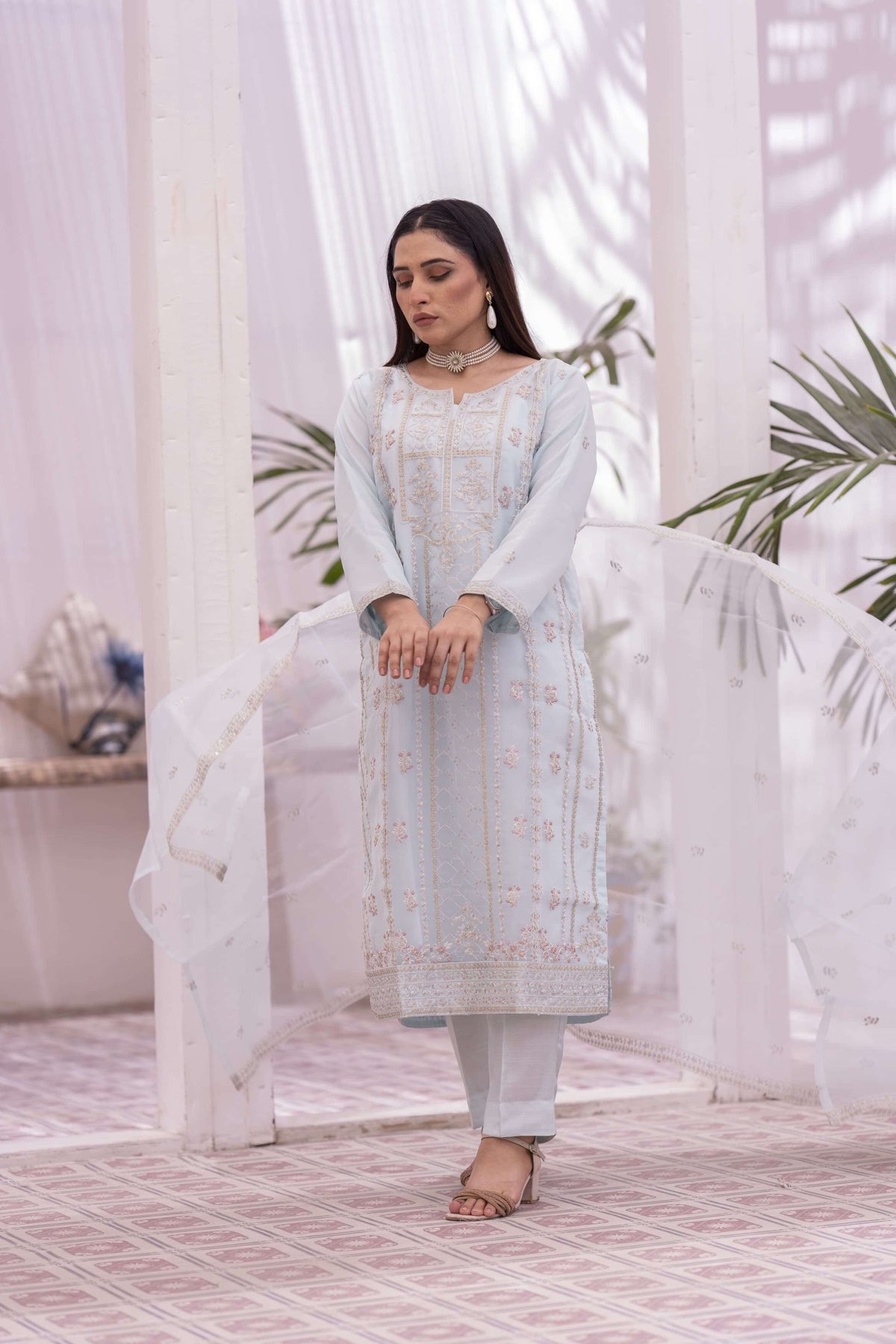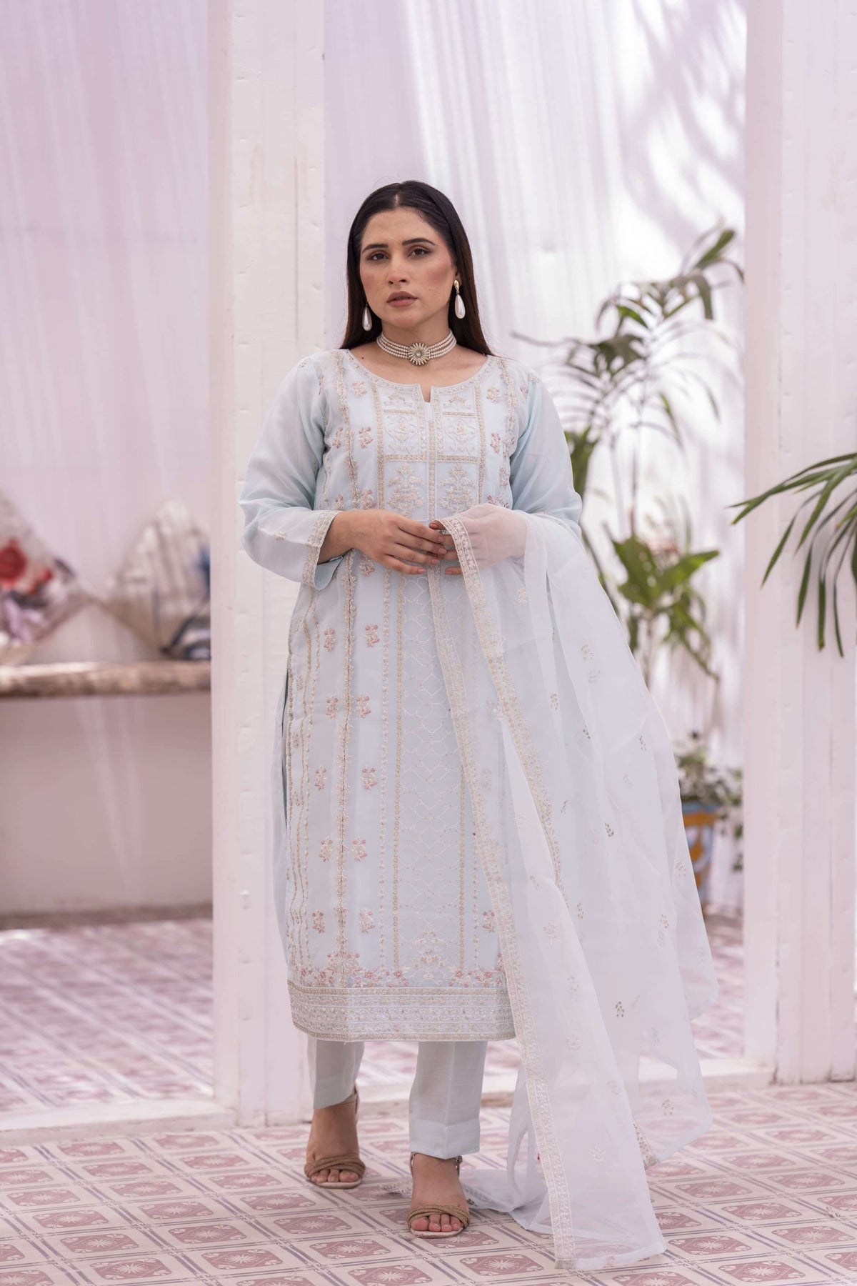 Women's Light Blue Organza Embroidered Shalwar Kameez Suit
