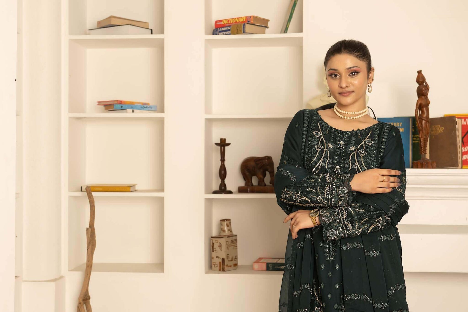 Bottle Green Chiffon Shalwar Kameez with Heavy Embroidery & Dupatta – Formal Suit for Women