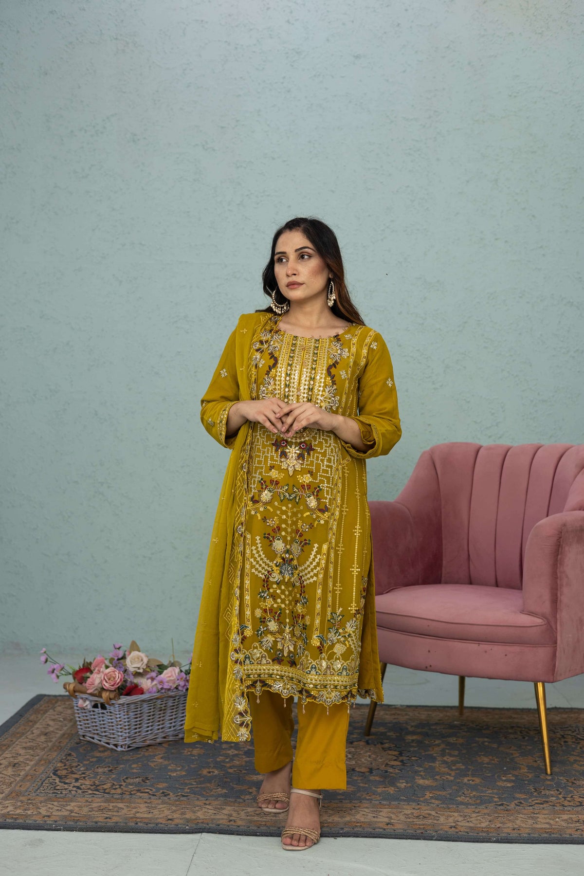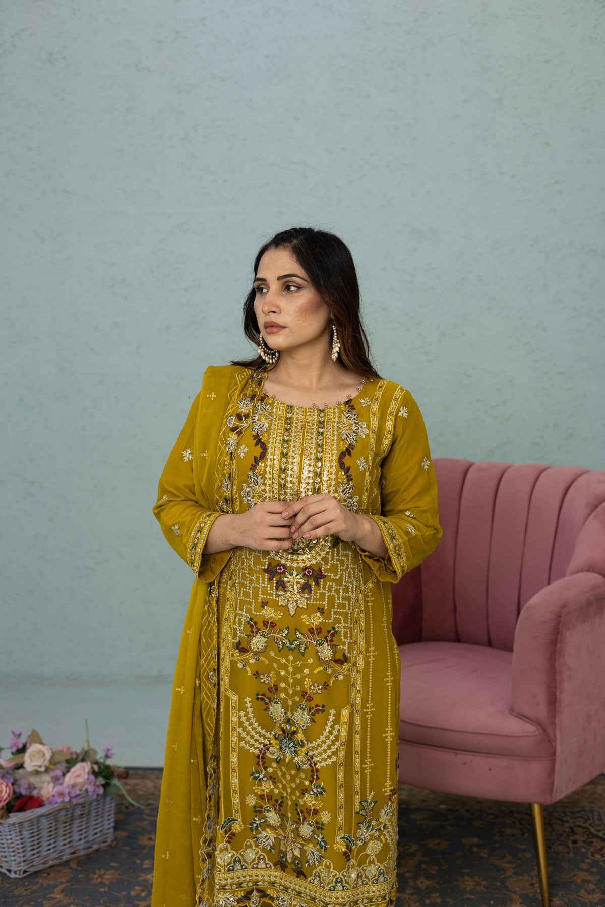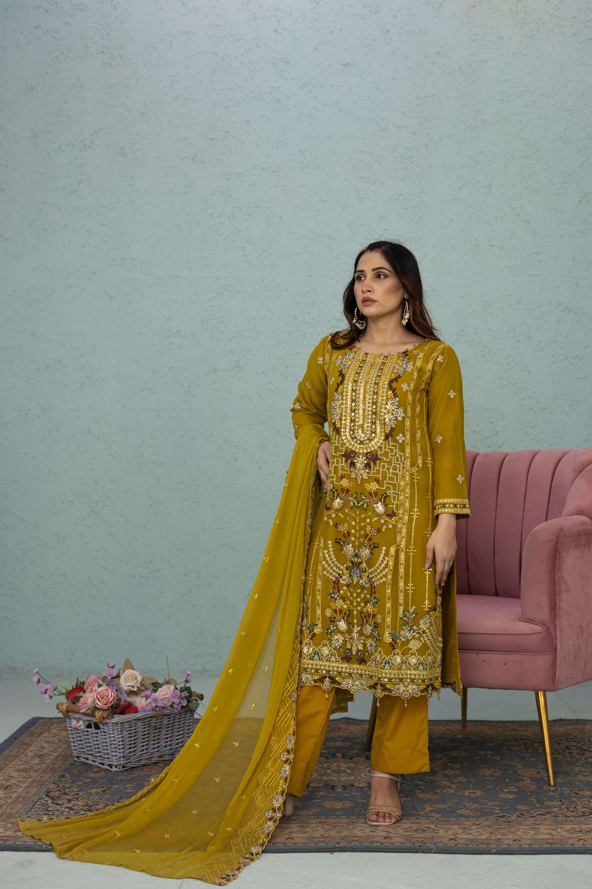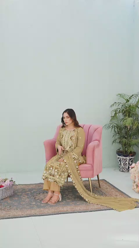 Elegant light mustard chiffon shalwar kameez with vibrant multicolor embroidery. 3-piece suit with kameez, shalwar, and dupatta. Ideal for weddings, Eid, or parties. Lightweight and luxurious. Free shipping.